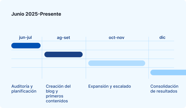 Muchas agencias se quedan en los informes y las recomendaciones. Nosotros montamos el blog, redactamos los contenidos, pusimos el tracking y fuimos optimizando cada mes. Así el equipo de Efis pudo centrarse en desarrollar su producto y delegar toda la parte SEO.